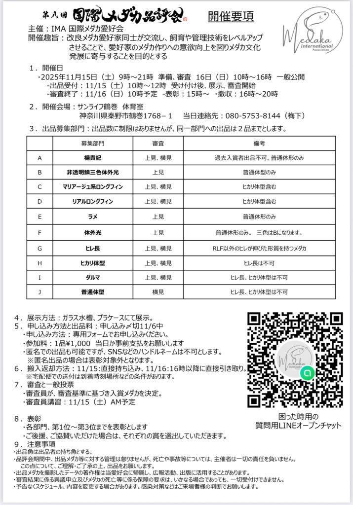 11月16日(日)第八回国際メダカ品評会を、神奈川県・秦野市・秦野市教育委員会の後援を頂き、サンライフ鶴巻で開催させて頂くことになりました。文化芸術事業としてのメダカ品評会、是非皆様にも楽しんで頂けますと幸いです。沢山のご来場、ご参加お待ちしております。
